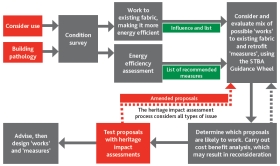 The holistic retrofit process following BS 7913: 2013 up to the advice and design stage: Dealing with existing fabric first. Inage source Retrofitting traditional buildings, from IHBC's Context 149, published in May 2017, written by John Edwards. http://ihbconline.co.uk/context/149/#13