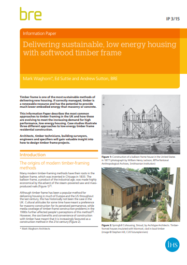 Delivering sustainable low energy housing with softwood timber frame (IP3/15) written by Mark Waghorn, Ed Suttie and Andrew Sutton and published by BRE on 13 January 2015. https://www.brebookshop.com/details.jsp?id=327484