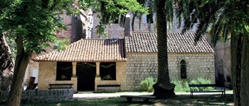 Traditional Mediterranean architecture is designed to reduce solar gain. Here the terracotta roof tiles of this chapel in the Elaphiti Islands, Croatia, provide evaporative cooling, the thick walls moderate the heat, and the trees and loggia provide shade. (Photo: Jonathan Taylor). Source: Circus eruption and the conversion of a Swansea chur Climate change: learning from the past in the Institute of Historic Building Conservations (IHBCs) Yearbook 2023. https://ihbc.org.uk/page55/yearbook/index.html Not for reuse.